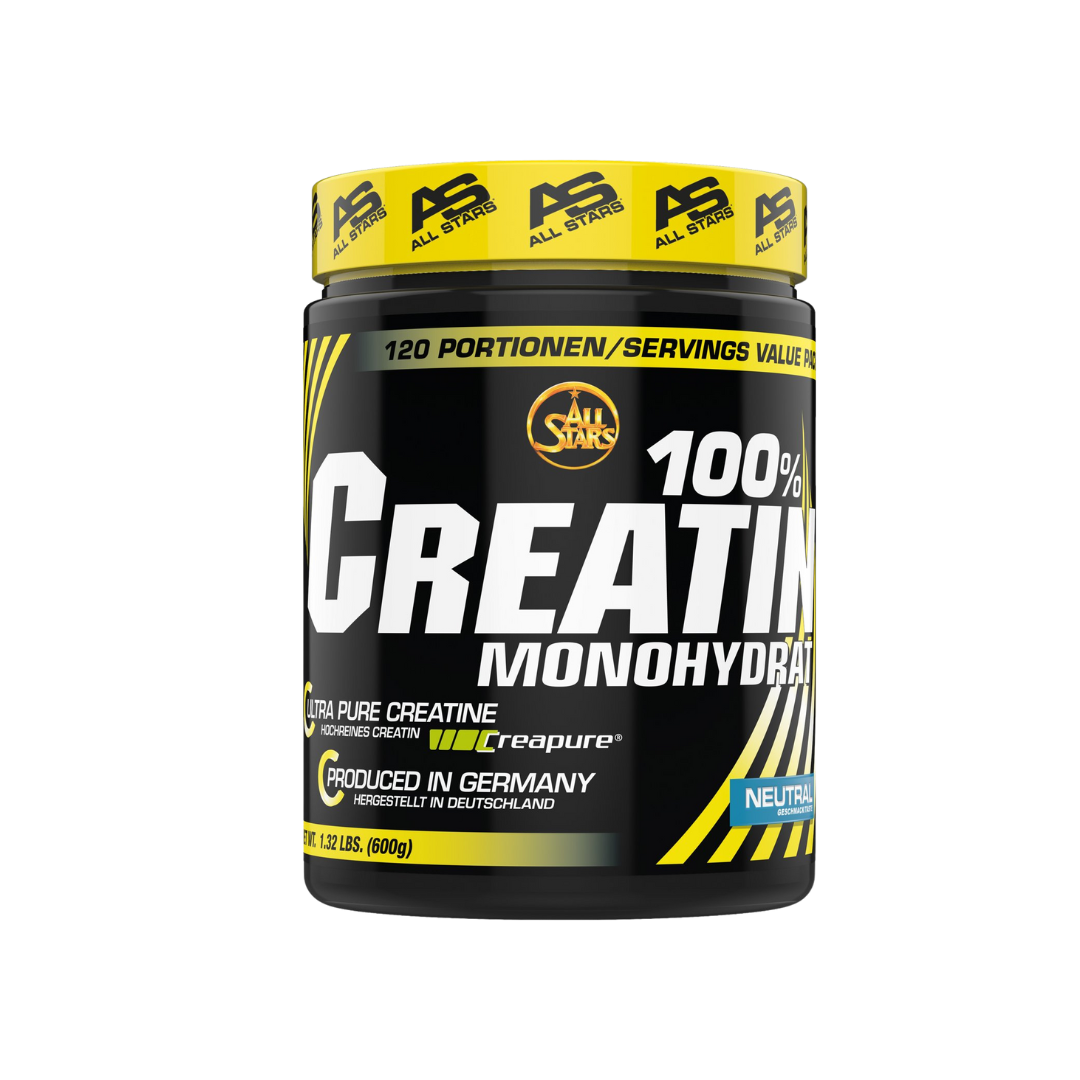 ALL STARS 100% CREATINE MONOHYDRATE 500g High purity creatine monohydrate. Neutralizing and rapidly dissolving Advantage pack with 100 portions Take 5g CREATIN per day. 5g corresponds to about 1 teaspoon of powder. Dissolve the powder in 200ml of water or fruit juice. For optimal results in the context of intensive training you should take CREATIN over a period of 8-12 weeks. Thereafter, the intake should be interrupted for 2-4 weeks. Then repeat CREATIN application. The recommended daily dose should not be exceeded. By taking CREATIN a weight increase can occur. The product is not suitable for children, adolescents and pregnant women. Keep out of reach of children.Take 5g CREATIN per day. 5g corresponds to about 1 teaspoon of powder. Dissolve the powder in 200ml of water or fruit juice.