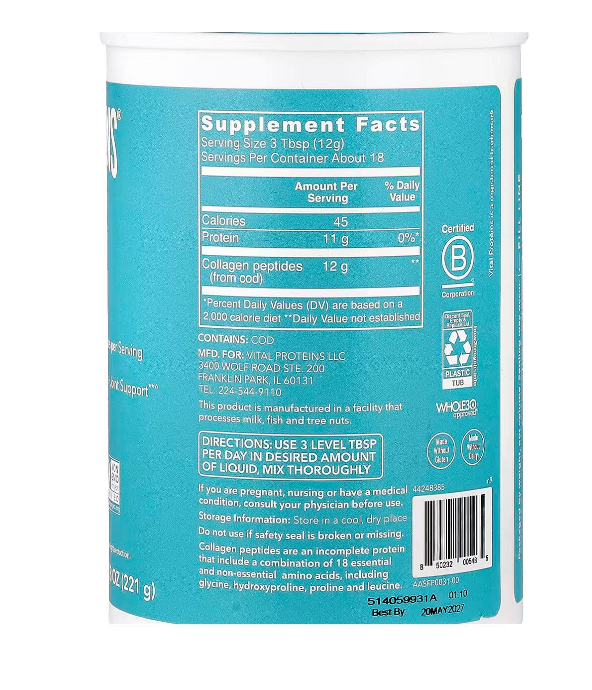 يتم الحصول على الكولاجين البحري الصديق للنباتيين من سمك القد البري، وهو يساعد على دعم صحة البشرة والشعر والأظافر والعظام والمفاصل. أضفه فقط إلى مشروبك المفضل أو وصفتك المفضلة واستمتع به!