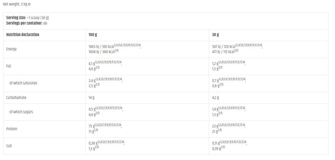 | Protein | 75 g1,2,4,5,6,7,8,9,10,11,12,13,14; 71 g3,15 |